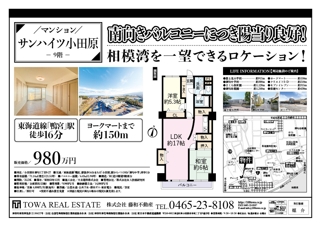 4月15日に新着物件情報 サンハイツ小田原 中古マンション 9階の情報を追加いたしました。