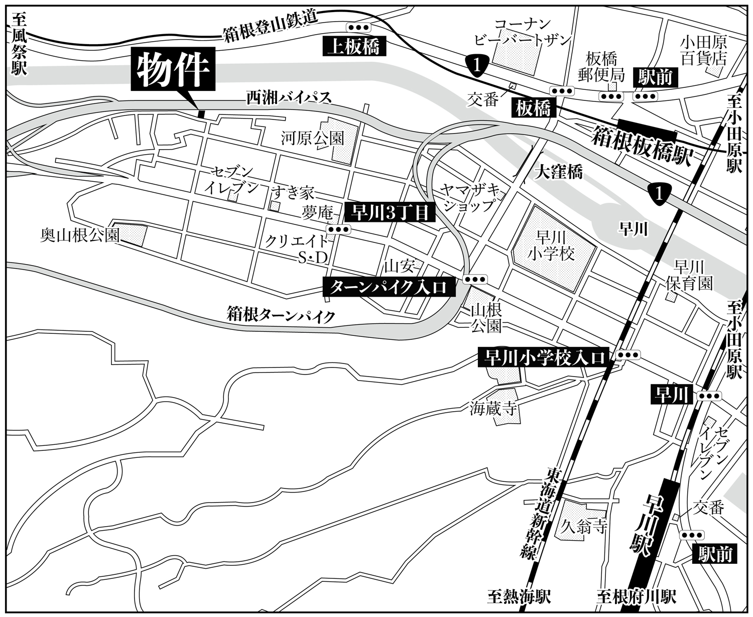 箱根登山鉄道「箱根板橋」駅から徒歩12分 JR東海道本線「早川」駅から徒歩18分