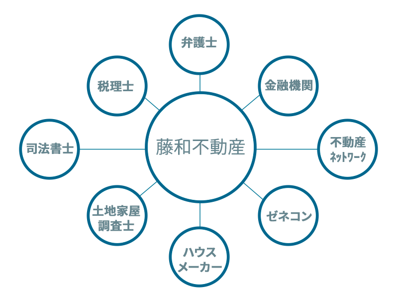 弁護士、税理士、一級建築士、土地家屋調査士、司法書士等との密接な連携で様々な問題を解決して、最適なご提案を致します。